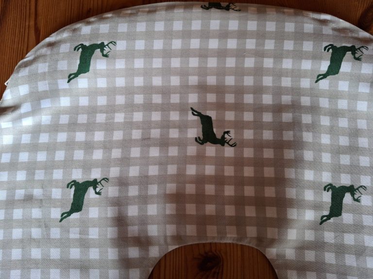 auf weißem Stoff, grau gedrucktes Karomuster und grüne Hirsche.