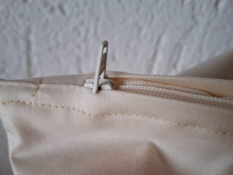 Wenn sie mit dem Reißverschluss am Ende angekommen sind, dann müssen sie den Zipper noch unter den Stoff weiter hinein schieben, bis es nicht mehr weiter geht. Die Querverriegelung verhindert, dass Dinkelspelz nach außen tritt. Wie auf dem Bild sichtbar, schaut nur ein kleines Stück von dem Zipper heraus. Dadurch stört er auch nicht.